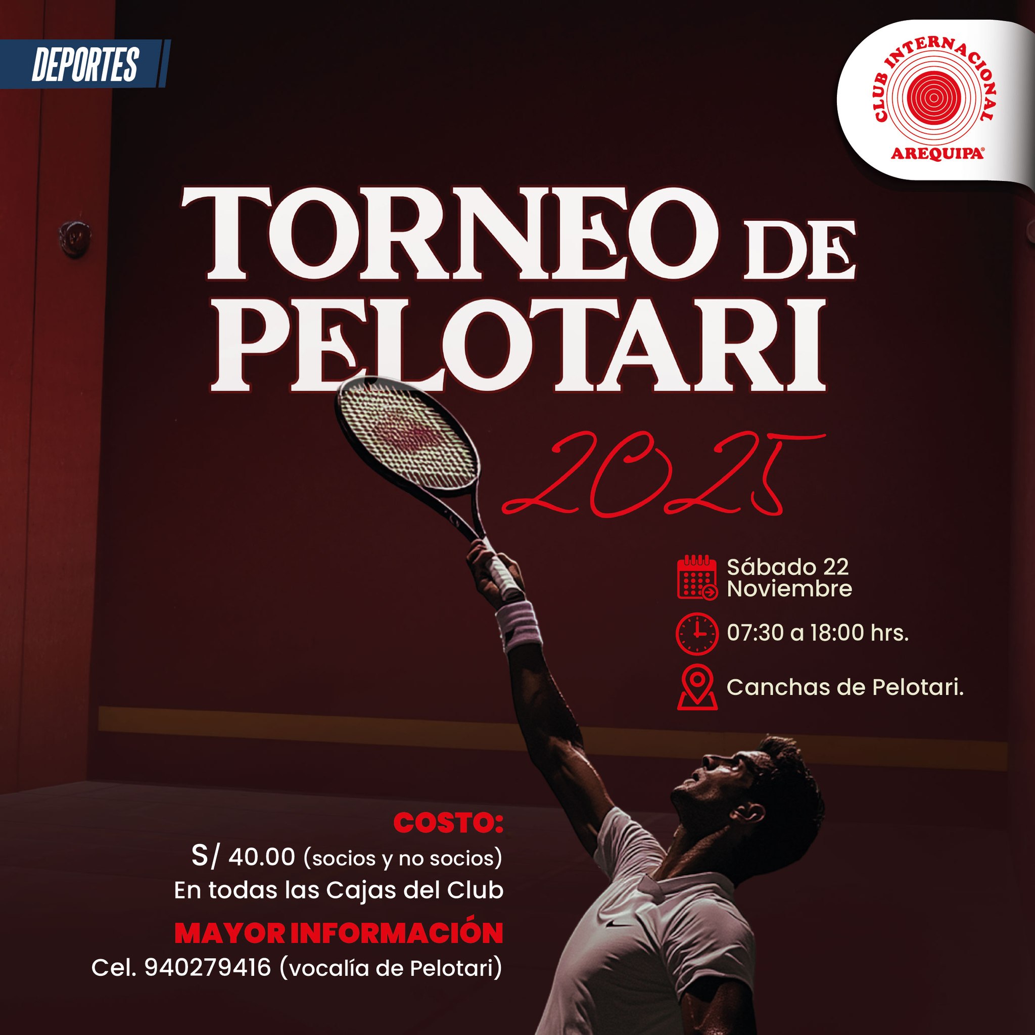 El Club Internacional Arequipa invita a todos sus socios y amantes del deporte a participar en el Torneo de Pelotari 2025, que se realizará el sábado 22 de noviembre, de 07:30 a 18:00 hrs, en las canchas de Pelotari.
